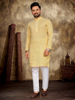 Celebrate festivals and special occasions in refined comfort with this men's kurta and pajama set crafted from pure linen cotton jacquard fabric. The breathable linen cotton blend ensures all-day comfort, while the intricate jacquard weave adds an elegant texture suitable for traditional events. Perfectly tailored, this ensemble combines classic style with premium fabric quality, making it an ideal choice for distinguished and comfortable festive wear.